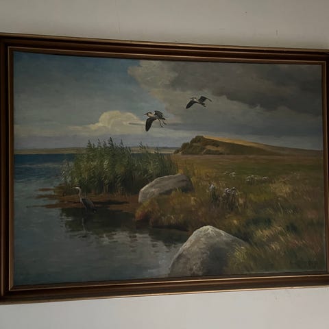 Smukt maleri af Carl Højrup: knager i sne fra 1922. Stemningsfyldt og smukt til stue eller måske sommerhus? H 81 x B 104 (inkl ramme). Kan