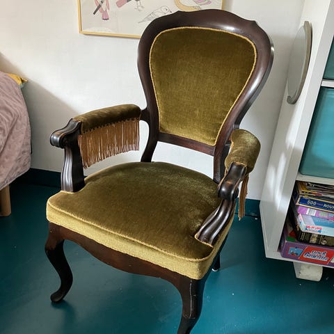 Fin retro lænestol i mørkegrøn. Den er købt brugt, men jeg har næsten ikke brugt den. Der er små pletter i stoffet - se billede.