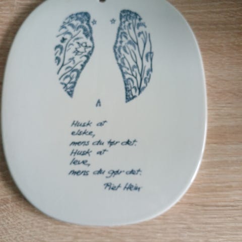 Royal Copenhagen Piet Hein fajance vægplakette i hvid med blå dekoration. Oval platte med hul for ophæng. Forsiden har tegning og tekstcitat af Piet Hein, bagsiden er stemplet med Royal Copenhagen-mærke, betegnelse "Fajance" samt årstal 1980 og modelnummer 30-3713. Velegnet som dekorativ vægplakette i hjemmet.