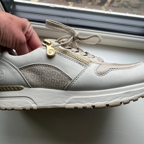Rieker sneakers i str. 42. Modellen er i beige og grønne nuancer med snørelukning og lynlås i siden. Overdelen er i kombination af tekstil og syntetisk materiale, og sålen er en kraftigere gummisål med mønster for bedre fodfæste. Indersålen er let polstret for øget komfort. Velegnet som hverdagssko.