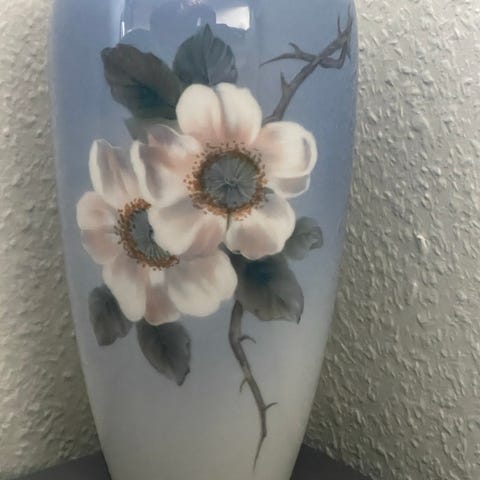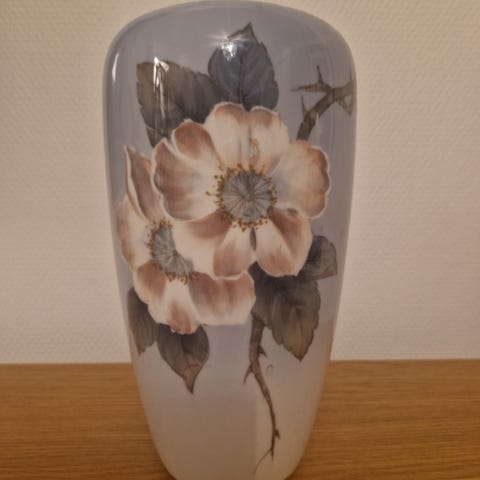 Porcelæn, Vase , Royal Copenhagen, RC 2630/1049 intakt smuk stor vase 23 cm høj malet med vildrose på forsiden og en sommerfugl bagpå. Baggrundsfarven er lys dueblå som lysner mod bunden.