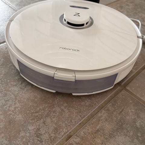 Roborock robotstøvsuger i hvid. Enheden er rund og leveres med ladestation, sidebørster, moppeklud og kantlister/afgrænsere som ses på billedet. Robotstøvsugeren er egnet til automatisk støvsugning af gulve i hjemmet og kan også anvendes til let gulvvask med den medfølgende moppeklud, afhængigt af model og funktioner. Velegnet til brug på hårde gulve og tæpper efter producentens anvisninger.