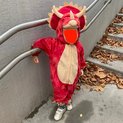 Dinosaur (T-Rex) udklædning med arme og hale. Brugt få gange.