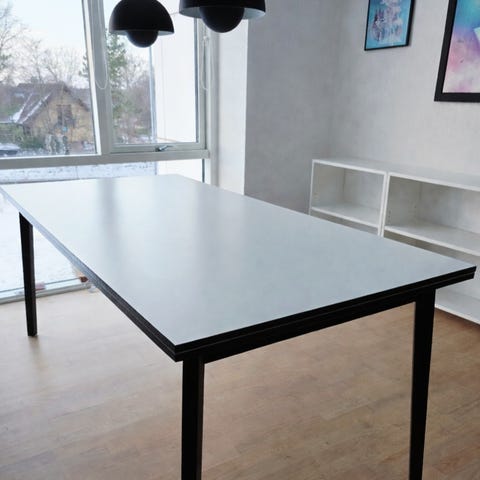 Spisebord i dansk design med hollandsk udtræk. Bordplade i hvidt melamin og ben i hvidolieret eg. Inkl. 2 tillægsplader, som opbevares under bordpladen og forlænger bordet fra 120 cm til 216 cm.