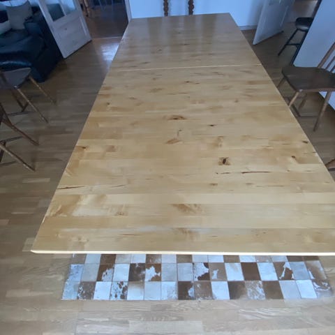 Moderne spisebord i lakeret bøg. Der er 2 tillægsplader (50x100) fineret bøg. Den ene plade har et mærke efter slibning.