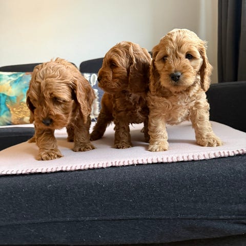 Hvalpene er 5 uger gamle, far er cockapoo, mor er cockapoo med et lille tvist af Chinese Crested Powder Puff. Det giver nogle helt unikke, bløde og charmerende hvalpe med masser af personlighed.