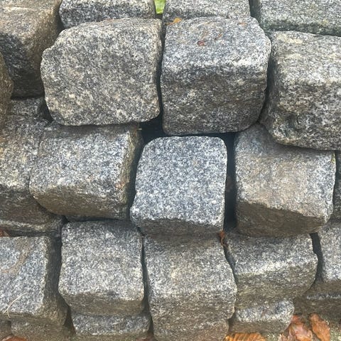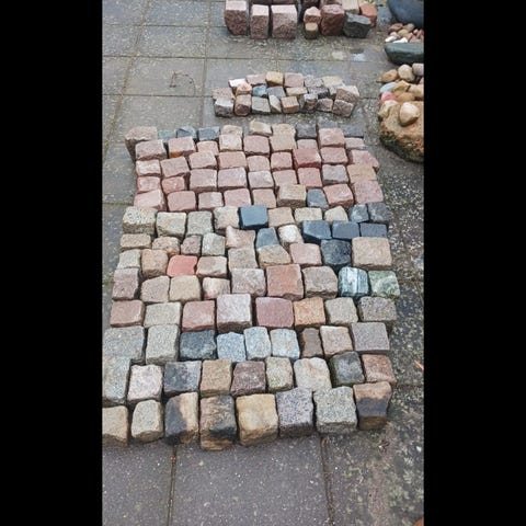 28m² af de sjældne og eftertragtede brugte chaussésten Blå Rønne, der er flot patinerede af slid fra hestevognshjul i gaderne i den gamle Randers middelalderby. Stenene sælges kun som et helt parti. De 28m² vejer ca. 5,5 ton. Prisen er pr. m². Køber skal selv tage stenene op og stå for transport.