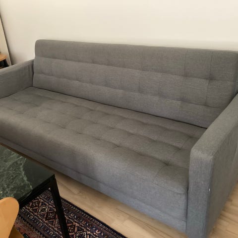 Sovesofa i grå. Den måler 140*200, når den er slået ud. Der er opbevaringsplads under den. Nem at slå ud. Den er brugt, men stadig behagelig.