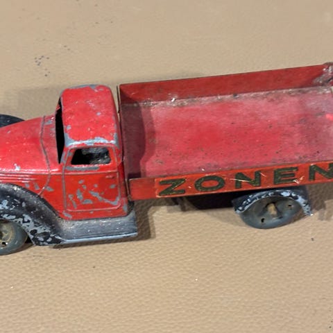 Tekno legetøjs lastbil betonblander i metal i rød og grøn. Modellen forestiller en betonblander-lastbil med drejelig tromle bagpå og detaljerede hjul og førerhus. Lastbilen er udført i støbt metal med malet overflade og påført Tekno-logo på tromlen - farver er med tiden skallet af - Egnet som samlerobjekt eller som klassisk legetøjsbil til leg med køretøjer og entreprenørmaskiner.