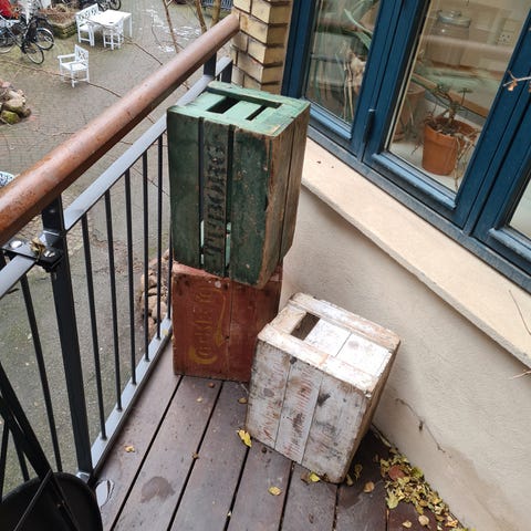 3 retro ølkasse i mørkebrun. Kan bl.a. stables til reol/hyldesystem eller bruges som sengebord.