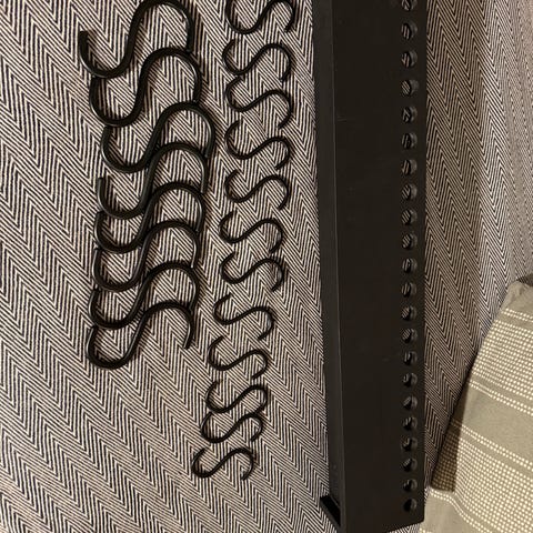 Nomess knagerække med ti kroge som har synlige brugsspor, da malingen er slidt af i de huller, hvor krogene har hængt.