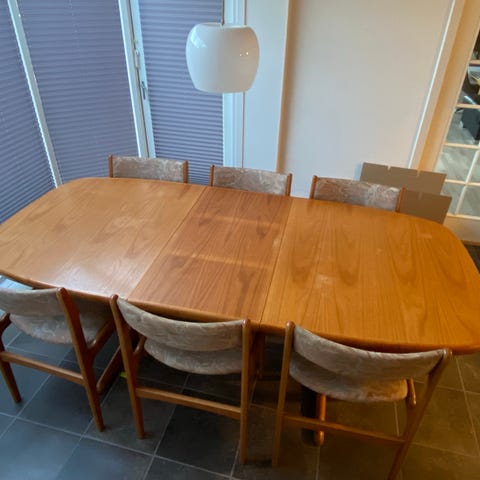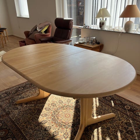 Flot ovalt Skovby teak spisebord med to tillægsplader. Bordet er i rigtig flot stand.