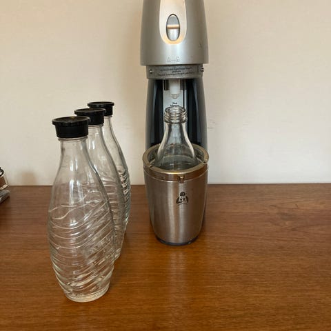 sodavandsmaskine i sølvfarvet design. Enheden er el-drevet og står på en metalfod. På billederne ses maskinen sammen med sodavandsflasker, som illustrerer anvendelsen til kulsyreholdige drikke. Maskinen er velegnet til brug i køkkenet til fremstilling af danskvand og sodavand efter behov. Yderligere tekniske specifikationer og modelbetegnelse fremgår ikke af oplysningerne.
