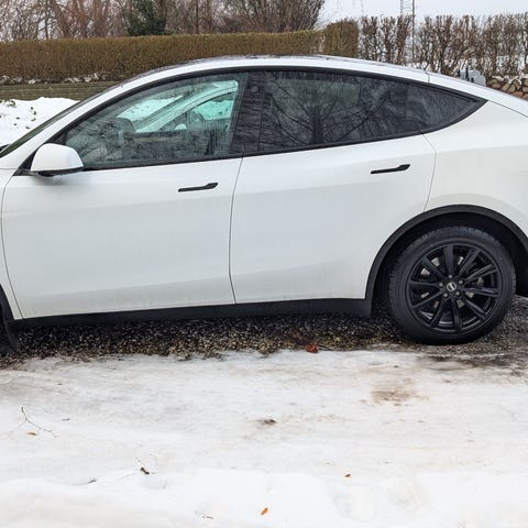 Vinterdæk med følge sidder på en Tesla model Y - brugt i 3 vinter
