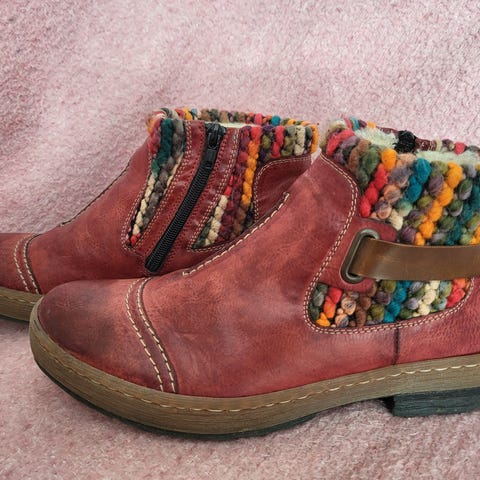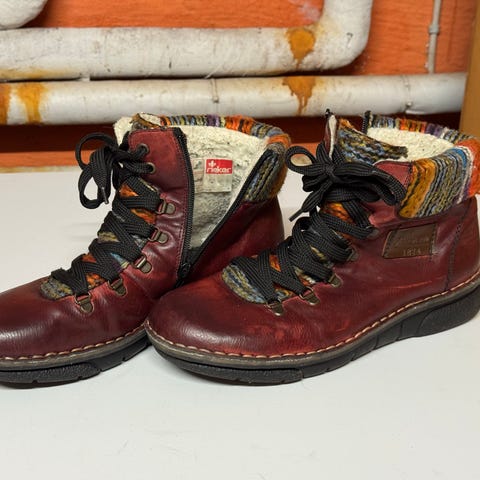 Super lækre Rieker støvler/vinterstøvler med lunt plysfoer. Støvlerne er næsten som nye, da de er brugt få gange. Farven er rød, med sorte nister, syninger, snørebånd samt lynlås på indersiden af støvlerne. Støvlerne er top komfortable, bløde og behagelige om foden. De kan potentielt passe fødder, som bruger str. 40-42, da de kan snøres så tæt eller så løst som nødvendigt. Har passet perfekt til str. 40-41 fødder, med god plads i længden.
