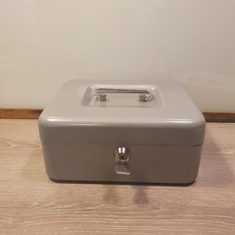Retro pengekasse i metal med tilhørende nøgle.H 6 cm, B 20 cm, D 14 cm.Gå til varen, for flere billeder.(A4).