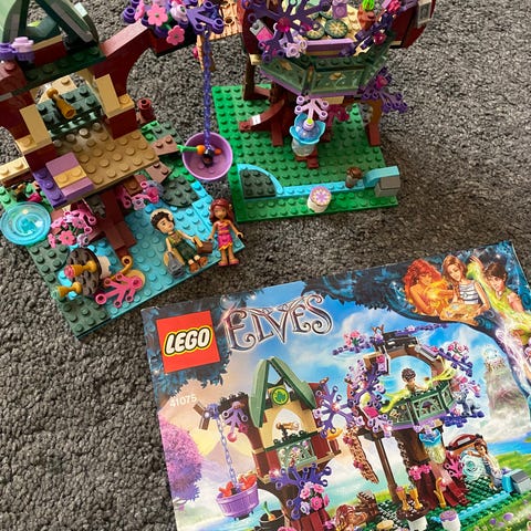 LEGO Elves alfetreetop-skjul byggesæt. Sættet forestiller et detaljeret trætop-hus i en fantasiverden med platforme, hus og hængekøje. Medfølgende minifigurer og giver mulighed for rolleleg i et alfemiljø. Indeholder forskellige tilbehørsdele som møbler, planter og små genstande, der kan bruges til at indrette trætop-skjulestedet og skabe forskellige lege- og spillesituationer.