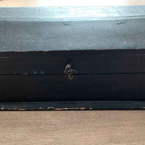Trækiste opbevaringsboks i mørkt træ. Kisten har buet låg og lukkes med lille metalbeslag foran. Indvendigt er der ét stort rum velegnet til opbevaring af for eksempel smykker, minder, småting eller dekoration. Kisten er udført i træ med synlig åretegning og står på flad bund, så den kan placeres på bord, hylde eller kommode.