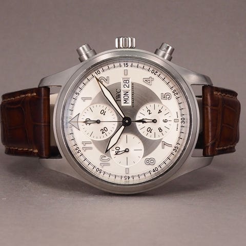 Her udbydes en IWC Pilot’s Watch Chronograph Ref. IW377713 – en særlig version inspireret af Antoine de Saint-Exupérys ikoniske univers. Modellen er kendt for sin varme, solbrune skive og fine detaljer, der giver et mere sofistikeret og sjældent udtryk end de klassiske sorte pilotmodeller.