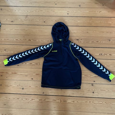 Hummel fodboldtrøje i børnestørrelse 158. Trøjen er blå med grønne ærmer og kontrastdetaljer på skuldrene. Kortærmet model velegnet til fodbold og anden sport. Materialet er let og åndbart syntetisk stof, der er egnet til aktivitet og træning for børn i omkring str. 158.