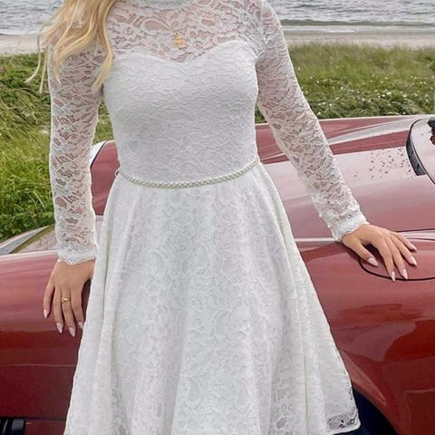 Der medfølger kjolens originale perlebælte (ikke på billedet) og en ekstra tilkøbt bælte (på billederne)