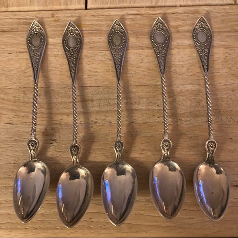 Gammel, men æske og skeer i meget fin stand. Trænger dog til pudsning.