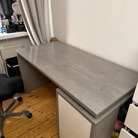 Skrivebordet er ca. 2,5 år gammel men har ingen brugsmærker. Kan skilles delvist ad og justeres til begge hjørne orienteringer.