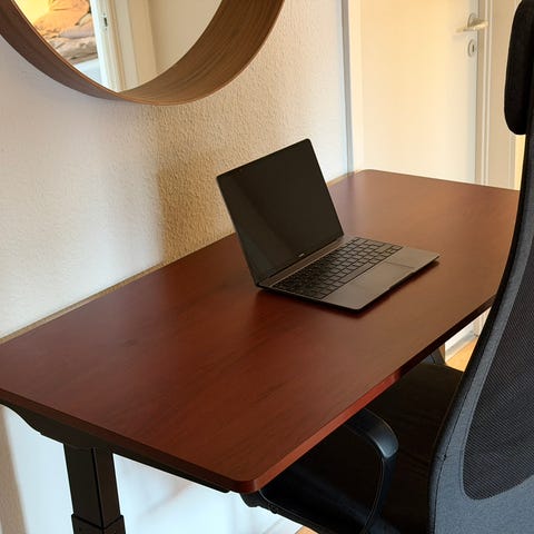 Rigtig fint Uno form skrivebord kan erhverves for 500 kr. Skal bæres ned fra 3. sal. Pænt og praktisk. 82 x 125 cm og højden er 75 cm.