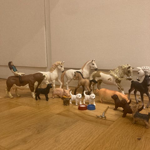 Schleich dyrefigurer og tilbehør blandet lot. Sættet omfatter flere heste, fantasiheste med vinger og ryttere, bondegårdsdyr som køer, får, hunde og geder samt forskelligt tilbehør. Tilbehøret inkluderer blandt andet dækkener, hovedtøj, hegn, hundehus og mindre stalddele. Egnet til leg med bondegård, hestestald og fantasiverdener for børn, der kan lide detaljerede dyrefigurer.