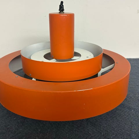 Retro hvid loftslampe kaldet Equator. Den er designet af Jo Hammerborg i slut-60’erne og produceret af Fog & Mørup. Den måler 40 cm i diameter og 24 cm i højden. God udvendig stand u. buler. Lampen har overfladerust dog mest til indersiden.