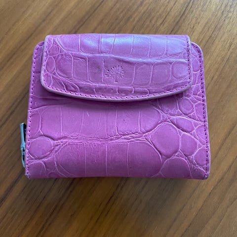 Mulberry pung i læder til kvinde. Pungen er fremstillet i læder med præget mønster og har lynlåslukning øverst. Indvendigt er der et enkelt rum med tekstilfor. Mål 12 x9x4 cm. Kan sendes efter aftale.