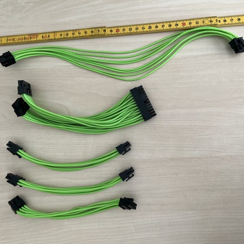 Sleeved strømforsyningsforlængerkabler i sort fra Dutzo. Indeholder: 1 x 24-pins ATX, 1 x 8-pins EPS & 2 x 6+2 / 8-pins PCI-E strømkabler, inkl kabelholdere (cable combs).