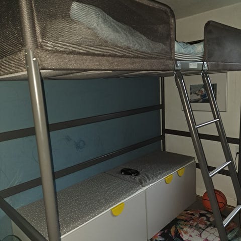 Sælger dette flotte og stabile højsengestel i hvid/lysegrå (90x200 cm).
