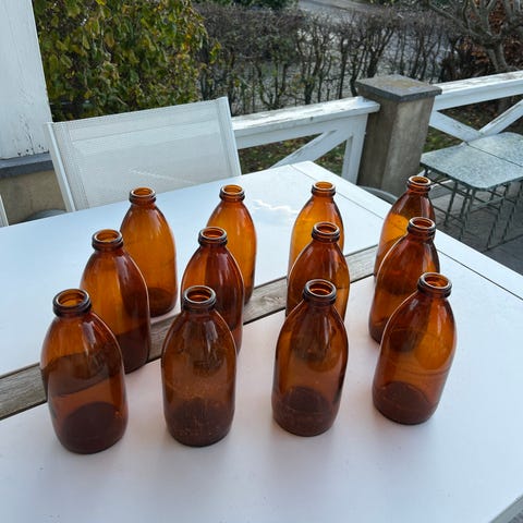 6 flasker m lyskædepropper brugt 1 dag til borddekoration til konfirmation sammen med vaser i forskellige størrelser .