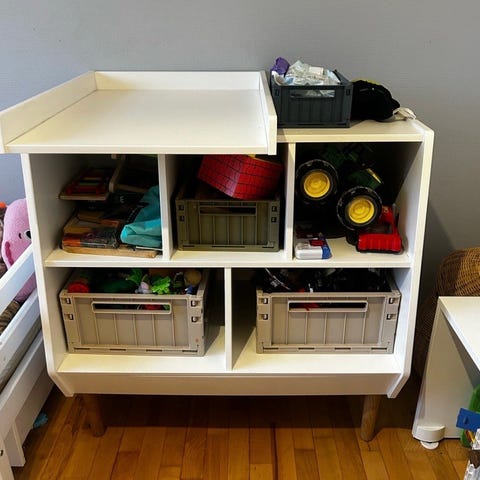 Changing table with 2 shelves and a puzzle pillow.