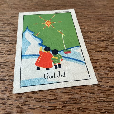 Fin lille original signeret collage i form af et julekort sendt af Eva-Maria Wiehe (1919-2012). Med 15 håndskrevne linjer og signatur af kunstneren. Måler 8 x 12,5 cm. Lilli rifter (ca. 1 cm.).