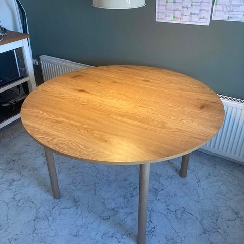 90 cm i diameter, massiv stål ben/fod, ingen hak i bordplade/kant