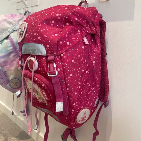 Perfekt til indskoling. Skoletaske med tilhørende idrætstaske, der let klipses på. Regnslag medfølger.