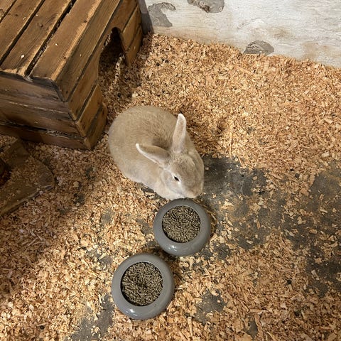 Sød kanin fra i sommers 2025 med bur savsmuld mad hule skåle og vandflaske