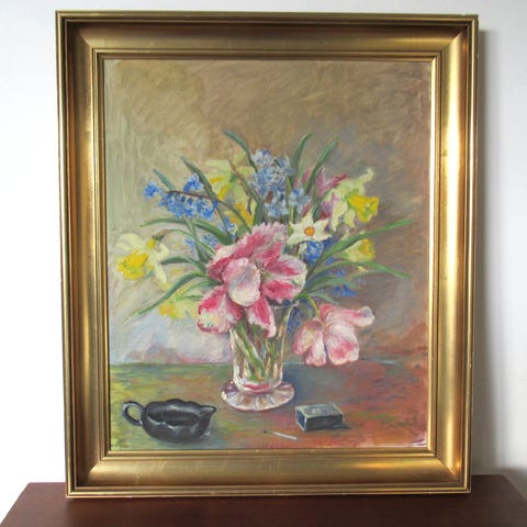 Skaber sommerstemning. Stokroser og pelargonier i klarer farver. Bred hvid træramme.