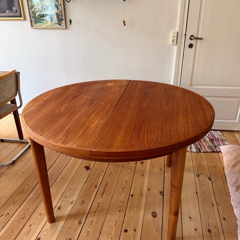 Midcentury rundt spisebord med 1 tillægsplade i teaktræ