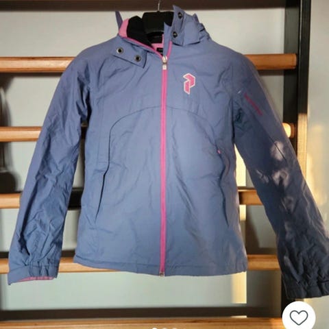 Peak Performance jakke i brun med lyserøde detaljer. Indvendigt er der en sort inderjakke, som kan tages ud og bruges separat.