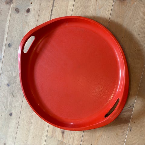 Rund retro plastic bakke med tiki mønster, der er brun hård plast på bagsiden. Ø: 35,5cm h: 2cm