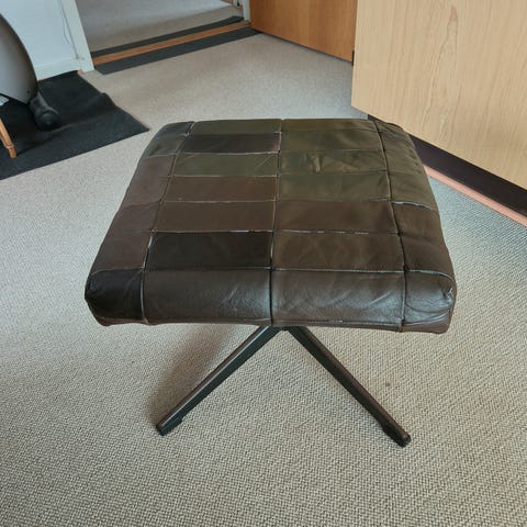 Skammel med træben og kunstlæder. Alm. Slitage på kunstlæder. Der er lidt skævhed i benene og er lidt ustabil, så ikke velegnet til at sidde på, men fungerer fint bare som fodskammel.