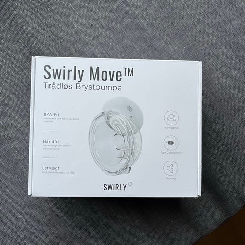 Swirly Move trådløs brystpumpe i BPA-frit materiale. Brystpumpen er håndfri og letvægt, så den kan bæres i bh’en under brug. Den har indbygget opsamlingsbeholder og betjenes via knapper på enheden. Egnet til udmalkning af brystmælk i hjemmet eller på farten. Leveres i original emballage med illustrationer og korte specifikationer på æsken.