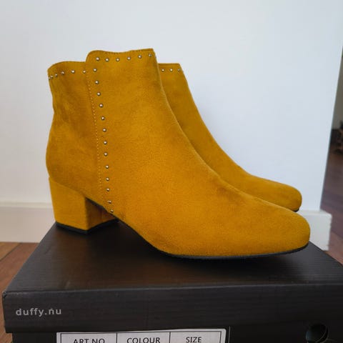 Smarte ankelstøvletter fra Duffy i reptilpræg samt små nitter. Str. 39. Lynlås på indersiden. Skafthøjde 15,5 cm. Fin stand fra røgfrit hjem. Sender gerne men køber betaler forsendelse.