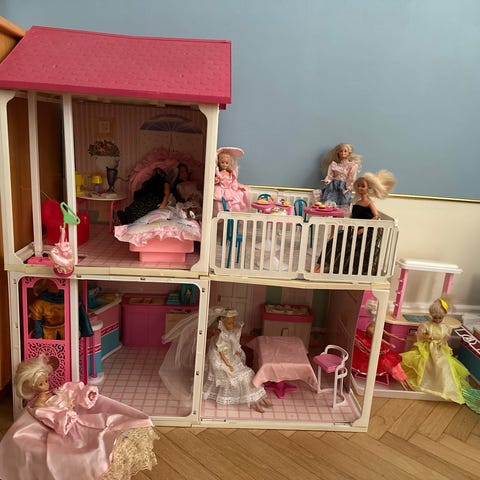 Barbie dukkehus med flere etager, pool og rutsjebane. Huset har forskellige rum, blandt andet stue, køkken, soveområde og badeområde. Der medfølger flere Barbie-dukker og tilbehør som møbler, bil, kæledyr og små dele til indretning og leg. Farverne er primært lyserød og pastelfarver. Egnet til leg med Barbie-dukker og lignende mode-dukker.