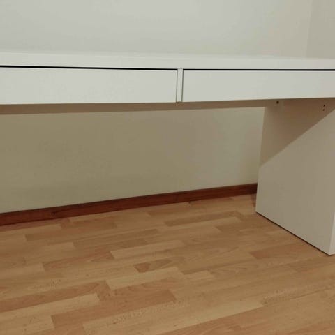 IKEA skrivebord i hvid. Bordet har integrerede skuffer og opbevaringsrum i den ene side samt en udtrækshylde under bordpladen, som kan bruges til tastatur eller ekstra arbejdsplads. Egnet som arbejds- eller studieplads i hjemmekontor, stue eller værelse. Design af Louis Weisdorf.