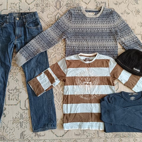 9 langærmet bluser, 1 skjorte, 4 par bukser og 4 T-shirt i str. 134-140.