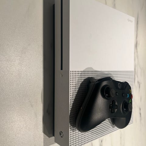 Microsoft Xbox One S konsol i hvid. Konsollen er en stationær spillekonsol fra Microsofts Xbox One-serie. Velegnet til spil, streaming og medieafspilning via HDMI-tilslutning. Understøtter trådløse controllere og forskellige lagrings- og netværksfunktioner afhængigt af konfiguration og tilbehør.